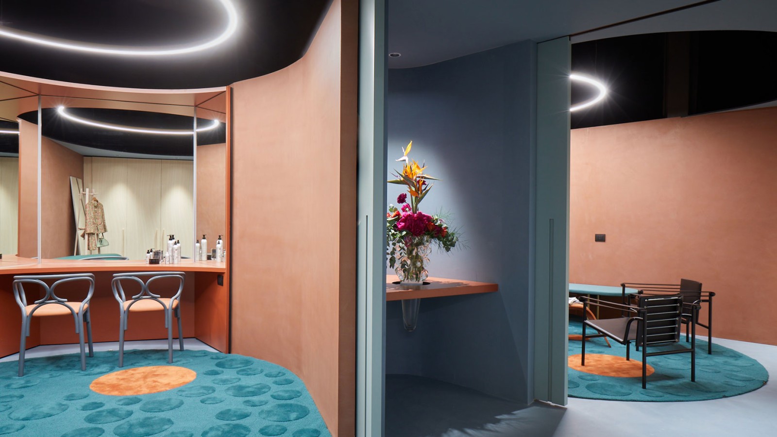 Nach intensiven Gesprächen mit den zukünftigen Garderobennutzerinnen und -nutzern entwarfen die Designer einen halbrunden Raum mit Schmink- und Wohnbereich, einer Küche und einem eigenen Bad. Weiche, runde Linien dominieren die Formensprache und sorgen für ein entspanntes Ambiente. Das Farbkonzept schafft es gekonnt, mit einem leuchtenden Orange und einem samtigen Petrolgrün Ruhe zu vermitteln.